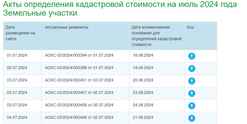 К примеру, дата постановки на кадастровый учет или дата внесения изменений характеристик объекта 24.06.2024г. Необходимо по таблице в столбце «Дата возникновения основания для определения кадастровой стоимости» найти дату 24.06.2024 и нажать на значок скачивания