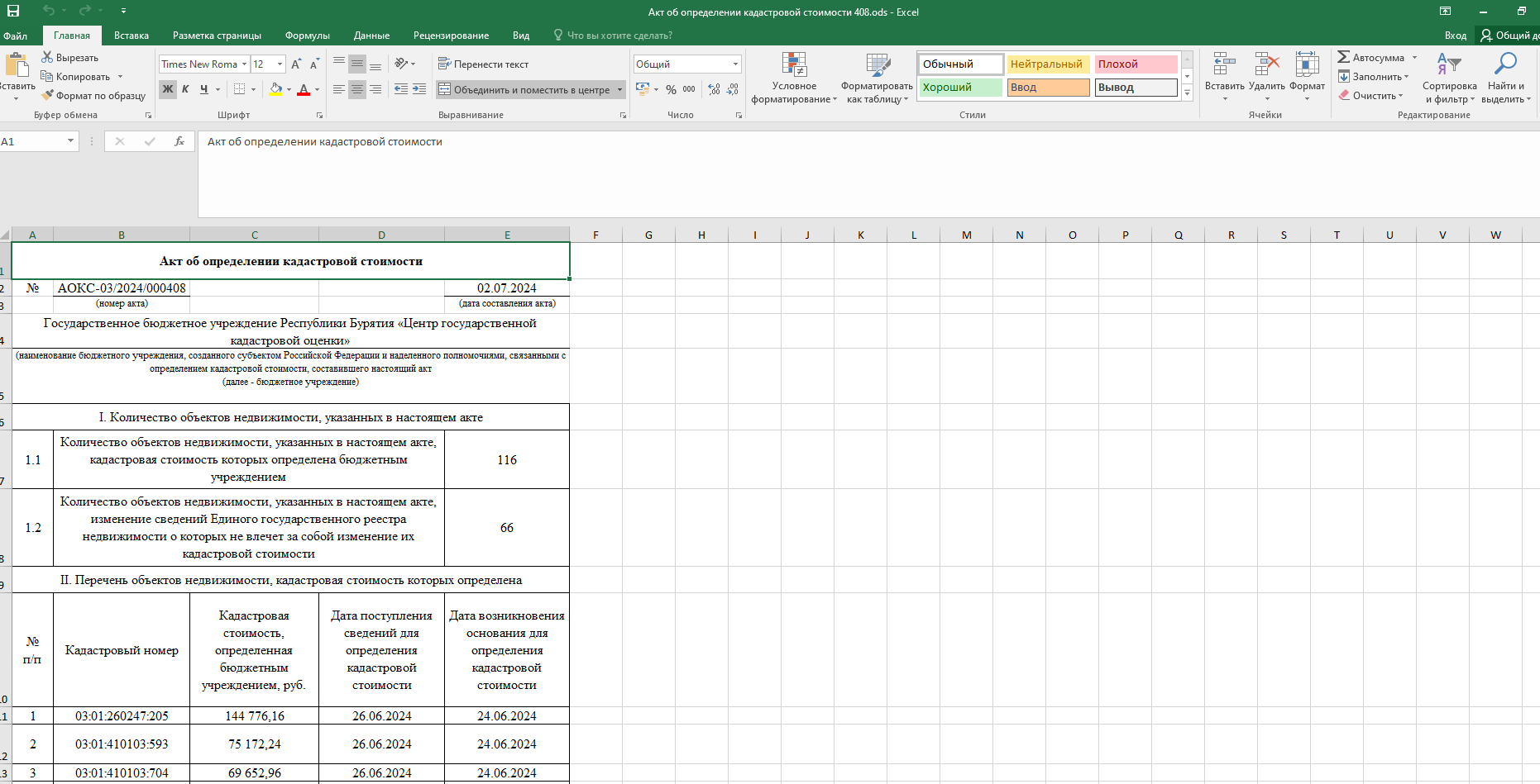 Скачается архивный файл формата zip. открыв данный файл вам понадобиться файл Акт об определении кадастровой стоимости формата ods .