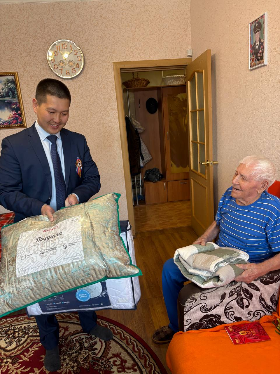 Пожелали ему крепкого здоровья и долгих лет жизни! Подарили на память подарки: одеяло, подушку, плед, торт и цветы.